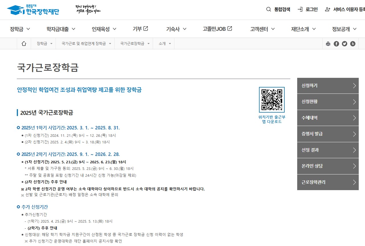 대학생이 교내 또는 교외의 근로지에서 일한 시간만큼 장학금을 받는 제도로, 등록금 이외에 생활비를 벌 수 있는 합법적이고 안정적인 방법입니다.