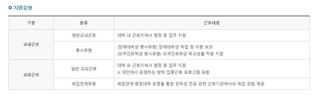 ※ 일부 유형(장애학생 보조, 취업 연계 등)은 학기 중 주당 40시간까지 가능