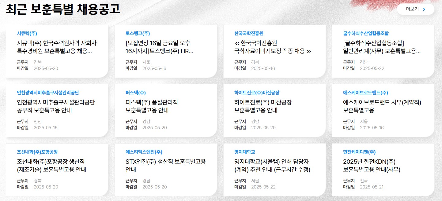 | 보훈특별고용 | 고용안정지원금 | 월 최대 100만 원 (6개월 한정) |