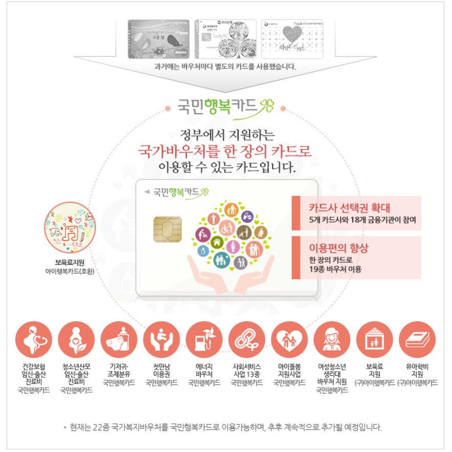 정부가 임신, 출산, 육아 과정을 돕기 위해 제공하는 통합복지카드가 바로 국민행복카드입니다.