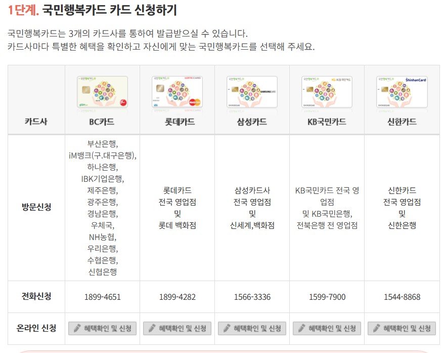 국민행복카드는 다음의 3개 카드사에서 발급 가능하며, 각 카드사별 부가 혜택이 다릅니다.