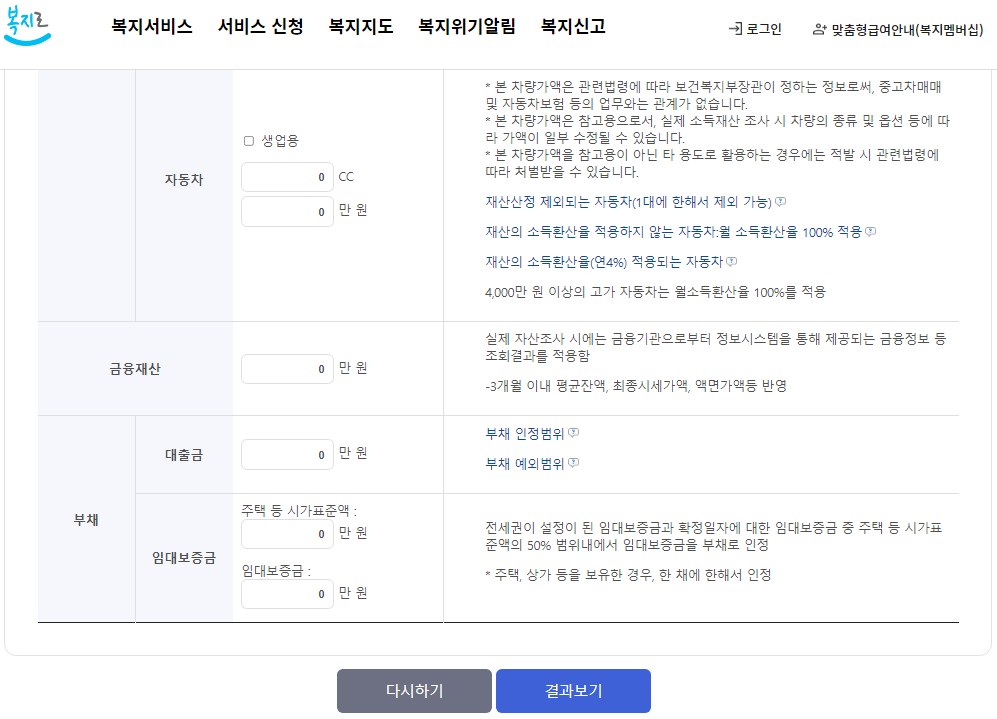 이름이나 주민번호를 입력하는 것이 아니라 소득과 재산만 입력하면 되므로 개인정보 걱정 없이 간단히 확인 가능합니다.