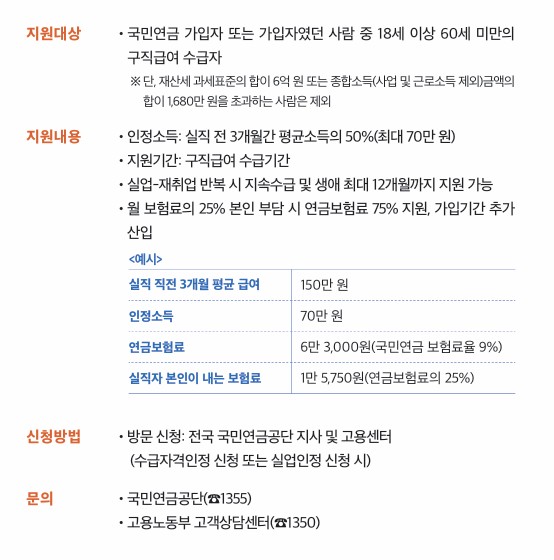 - 지원 내용: 국민연금 보ㅎ료의 75%를 정부가 지원 / 본인이 나머지 25%만 부담