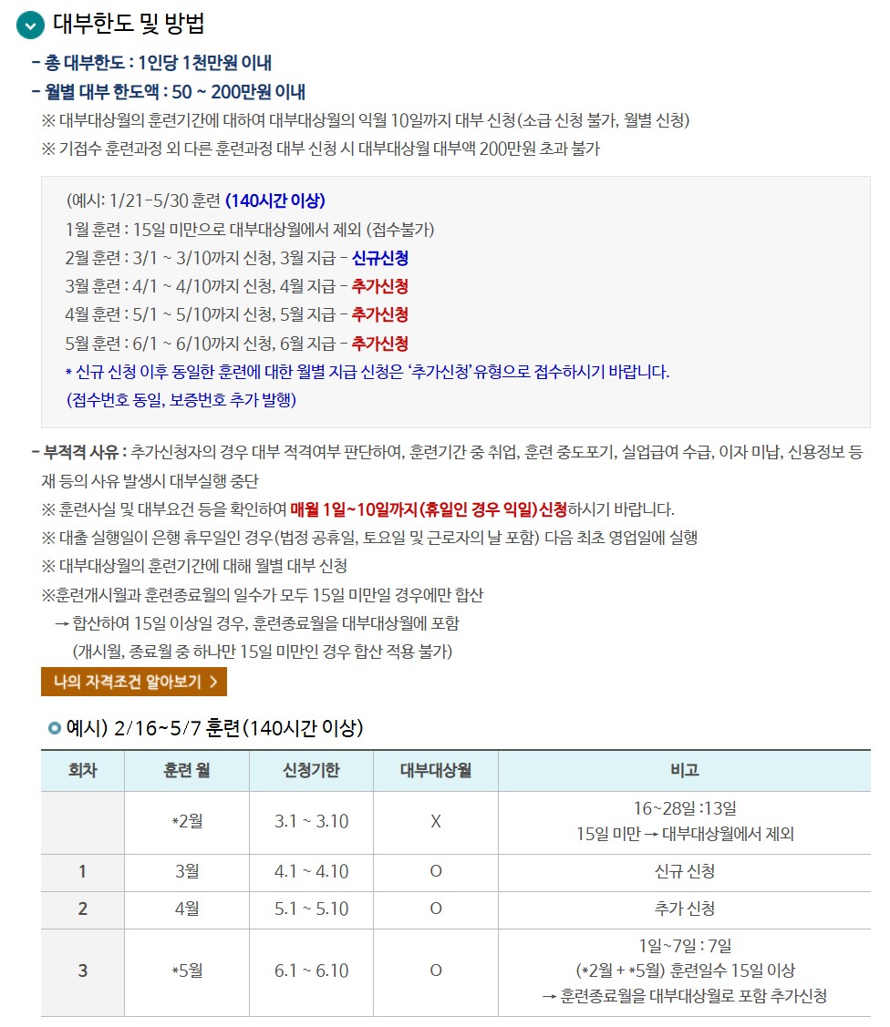 | 일반 훈련생 | 최대 1,000만원 | 월 200만원 이내, 연 1% 이자 |