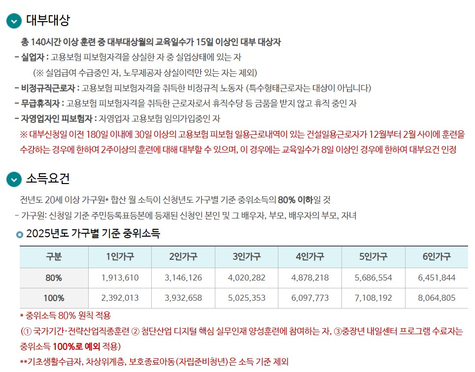단, KDT, 국가기간‧전략산업직종훈련, 중장년 내일센터 참여자는 기준 중위소득 100% 이하도 가능하며, 특별고용지원업종에 종사하는 자, 고용위기지역 근로자‧무급휴직자, 특별재난지역 거주자는 소득 수준과 상관없이 지원 가능합니다.